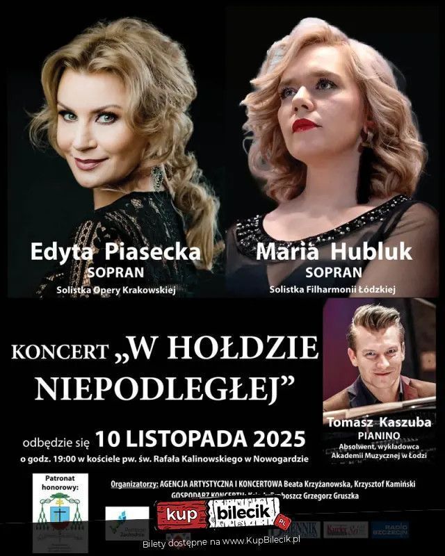 Koncert w ramach obchodów Narodowego Święta Niepodległości ,,W Hołdzie Niepodległej,, w wykonaniu Edyty Piaseckiej (sopran) & Marii Hubluk (sopran) i Tomasza Kaszuby (pianino), który odbędzie się 10 listopada o godzinie 19.00 w kościele pw. Św. Rafała Kalinowskiego, Jana Pawła II 2. Patronat Honorowy: Arcybiskupa Metropolity Szczecińsko-Kamieńskiego Wiesława Śmigla, Marszałka Województwa Zachodniopomorskiego Olgierda Geblewicza, Burmistrza Nowogardu.